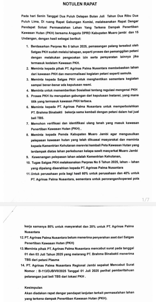 Namun, sebagai bentuk kepedulian terhadap nasib petani, DPRD dan peserta rapat meminta kepada PT. Agrinas Palma Nusantara untuk segera membebaskan lahan dari status kawasan PKH dan menormalkan kembali aktivitas petani seperti semula.